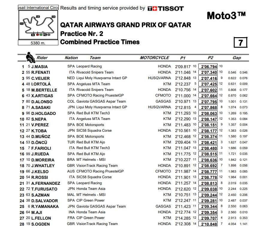 È successo di tutto, Oncu rallentato da Ueda, Masia da Veijer (caduto subito dopo). Jaume è stato poi ostacolato a lungo da chi cercava di prenderne la scia, scene purtroppo già viste. Ciò nonostante, il pilota della Honda è riuscito a rifilare mezzo secondo al secondo classificato, Romano Fenati che senza bisogno di scie ha segnato un ottimo tempo (il Qatar è tra i suoi circuiti preferiti) e come spesso succede da qualche gara a questa parte (peccato che non riesca a ripetersi in gara). Stefano Nepa, migliore italiano classificato dopo il pilota di Ascoli Piceno, è finito al decimo posto. Fabio Farioli è invece il primo degli esclusi dalla top 14, Riccardo Rossi si è fermato in ventesima posizione.
