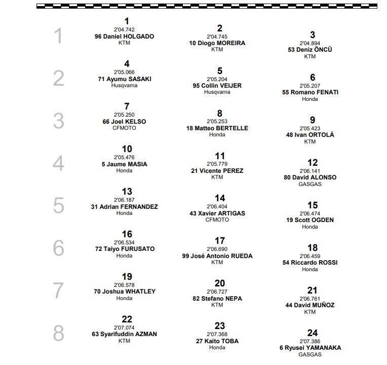Fosse andata diversamente per il pilota di Bergamo, avesse fatto un tempo migliore dell’undicesimo registrato alla fine, domenica dovrà comunque partire dall’ultima fila, per aver ostacolato Masia, nelle prove di venerdì (motivo per cui dovrà scontare anche un long lap). Il leader del mondiale non ha brillato. A un passo dal match ball per chiudere il mondiale s’è piazzato decimo, sei posizioni staccato dal suo avversario principale, Ayumu Sasaki finito in seconda fila col quarto tempo, dietro a Ortolà. Nel finale, tra i due contendenti si sono pure infilati Veijer, alle spalle del giapponese, e Romano Fenati con un giro in solitaria, alla sua maniera, a tempo ormai scaduto, che gli vale la sesta posizione in griglia. In solitaria s’è pure messo in luce Deniz Oncu, in gran forma, due volte davanti senza bisogno di farsi tirare.