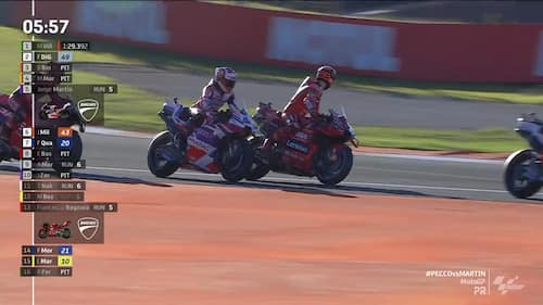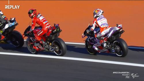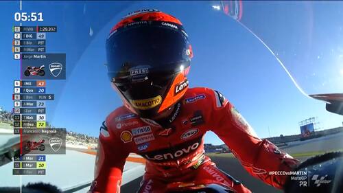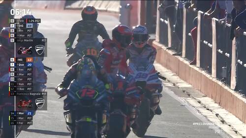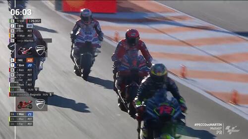 Finale di pre-qualifiche ricco di tensione a Valencia tra i due sfidanti per il titolo Bagnaia e Martin: Jorge ha scelto di marcare a uomo Pecco, che si è innervosito e non è riuscito a fare un tempo utile per centrare l'accesso diretto al Q2 delle qualifiche. "Mi sono voluto far sentire, le parole in conferenza stampa non servono a nulla", ha detto lo spagnolo della Pramac. "Pensi a sé stesso, noi siamo in vantaggio e lui deve vincere due gare", la risposta del torinese