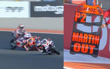 - Ecco il momento decisivo. Martin era già scivolato all'ottavo posto dopo un attacco - con contatto - al leader Bagnaia, primo. Nel tentativo disperato della rimonta va a contatto con Marquez.