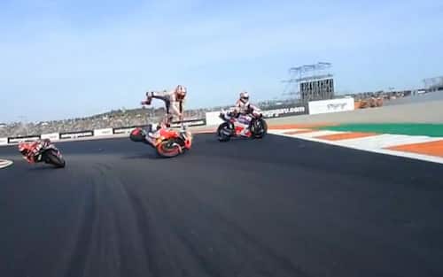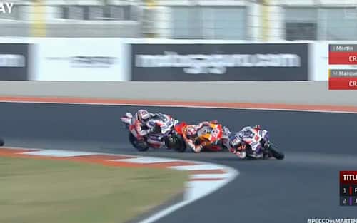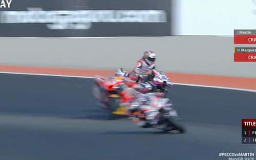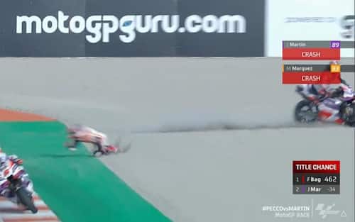 È successo durante il sesto giro dell'ultimo e decisivo GP, Il pilota Pramac ha toccato la Honda di Marquez, sbalzato via. Anche Martin scivola una volta entrato in contatto con la ghiaia chiudendo in anticipo la sua domenica a Valencia. L'aritmetica ha quindi consegnato il titolo di campione del mondo a Bagnaia prima ancora della fine del GP. La fotosequenza della caduta