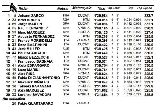 Episodio chiave durante il warm up del GP Valencia, ultima gara dell'anno che assegnerà il titolo. Vinales ha avuto un problema, ha ricevuto una bandiera nera con disco arancione (che impone di fermarsi immediatamente), ma lo spagnolo è invece tornato al box. Il poleman Aprilia è stato penalizzato di tre posizioni, pertanto sarà Bagnaia a partire dalla prima casella. Il più veloce nel warm up è stato Zarco, 3° Martin, 12° Bagnaia. Gara alle 15 in diretta su Sky e NOW