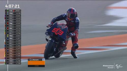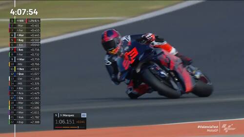 - Inizio molto convincente quello di Marc Marquez sulla Ducati del team Gresini. Il pilota spagnolo si è subito trovato a proprio agio sulla Desmosedici GP23 (quella che ha appena consegnato il secondo titolo mondiale a Bagnaia), chiudendo col 4° tempo i test di Valencia in 1:29.424, a 178 millesimi dal miglior crono di Maverick Vinales
