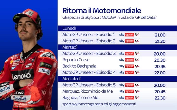 programmazioneSettimana ricchissima di speciali su Sky Sport MotoGP e in streaming su NOW, con diversi contenuti in onda a partire da lunedì 4 marzo che ci accompagneranno in vista della stagione 2024, al via il prossimo weekend dal circuito di Lusail. Ecco la programmazione completa sui nostri canali