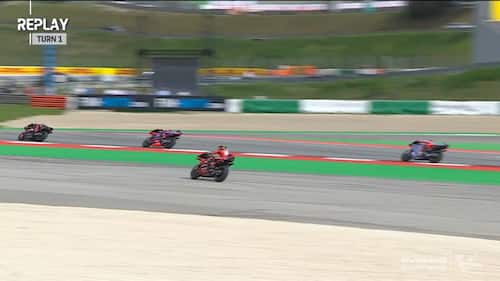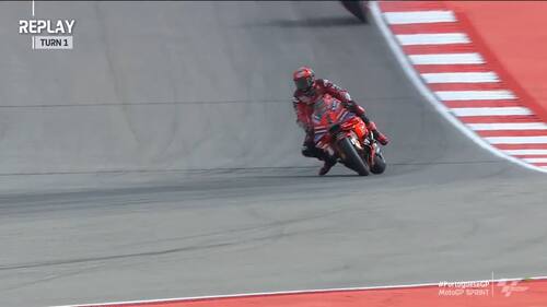 Quarto posto nella Sprint per Bagnaia che, dopo essere balzato al comando con una super partenza, è andata lungo alla staccata dopo il rettilineo quando mancavano 4 giri alla fine. "Stavo gestendo tutto bene, purtroppo non ho fatto i conti con la benzina - ha spiegato a Sky Sport -. Il posteriore mi si stava alleggerendo troppo, ho commesso un errore di valutazione". Di seguito la fotosequenza dell'episodio che, di fatto, ha deciso la corsa del sabato