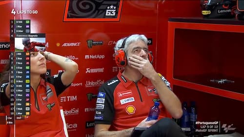 - La reazione di Gigi Dall'Igna e di Carola, sorella di Pecco Bagnaia, dopo l'errore del campione del mondo che gli è costato il successo nella Sprint