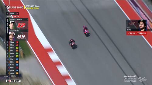 - Sfruttando anche l'out di Marquez, caduto mentre era in testa, Vinales si trova in zona podio. Non contento, prende la scia di Martin e lo passa mettendosi al 2° posto all'inseguimento di Acosta