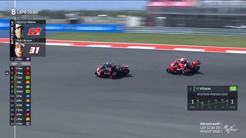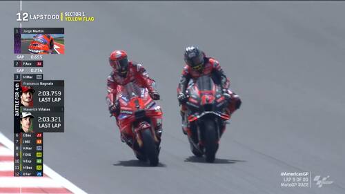 - A 12 giri dal termine, Maverick è già risalito in 5^ posizione. A questo punto il rivale diretto è Pecco Bagnaia su Ducati. Vinales prende le misure e passa il campione del mondo, lanciandosi all'inseguimento della zona podio
