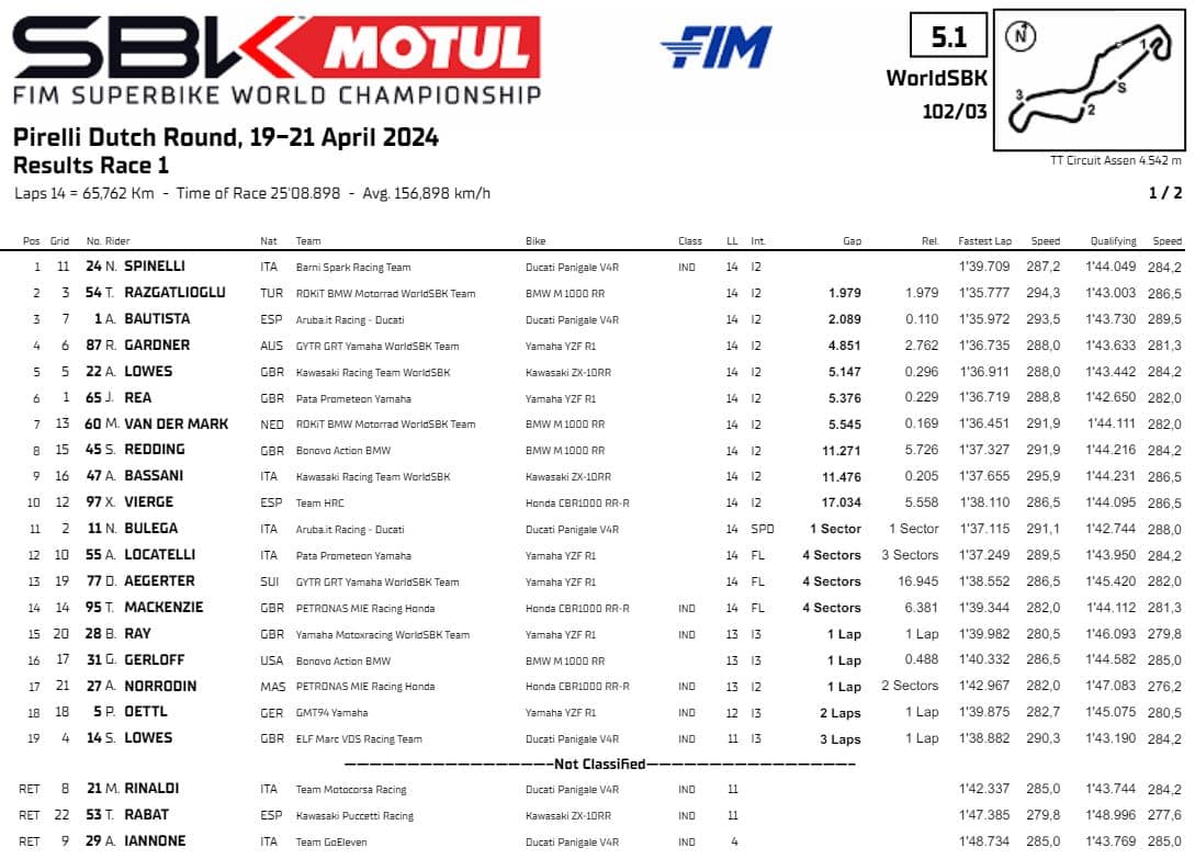 È una storia incredibile, quella andata in scena in Gara 1 ad Assen. Che il meteo potesse rimescolare le carte era ampiamente preventivato, ma che potesse regalare un vincitore così improbabile era francamente impensabile. Così, Nicholas Spinelli diventa l’eroe del sabato vincendo la sua gara di debutto nel mondiale Superbike, dopo aver preso in mano la Ducati del Barni Spark Racing Team in sostituzione dell’infortunato Danilo Petrucci. Al campione italiano Supersport 2022 va il merito di non aver compiuto alcun errore, gestendo perfettamente tutta la corsa.