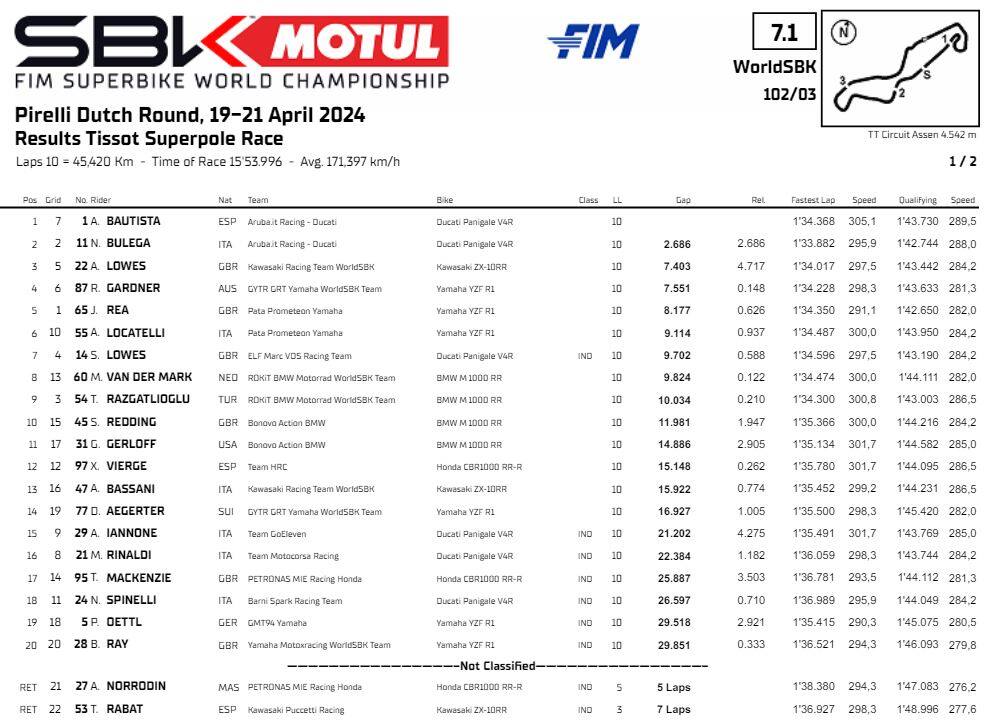 Nel pomeriggio Toprak ha giocato in contropiede scegliendo le Pirelli SC2 davanti e SC0 dietro, più dure di uno step rispetto a Bautista (SC1 e SCX). La scelta ha pagato e, per quanto non determinante, gli ha dato la vittoria in una gara rallentata da un po’ di pioggia nella fase centrale. Il tentativo di recupero di Bautista negli ultimi giri si è infranto contro la consistenza di Razgatlioglu, che ad Assen (così come la BMW) non aveva mai vinto. Alvaro si consola con la leadership in campionato, con Toprak staccato di sei punti.