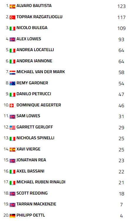 Grande gara anche per Remy Gardner, finalmente capace di conquistare il primo podio in Superbike. L’australiano di Yamaha GRT si è dimostrato veloce in tutte le condizioni e ha chiuso terzo con merito, restando vicino ai primi due. Alle sue spalle, Andrea Iannone rimedia col quarto posto a una Superpole Race complicata, chiusa in quindicesima piazza. Il pilota di Vasto ha avuto la meglio su Andrea Locatelli, mentre più staccati hanno concluso Sam Lowes e Dominique Aegerter, partito addirittura diciannovesimo. Ottava posizione per Bulega, che ha scalato una posizione beneficiando della penalità inflitta a Michael Van Der Mark per un taglio all’ultima variante; l’olandese ha chiuso nono. Michael Rinaldi si è piazzato tredicesimo, con Nicholas Spinelli sedicesimo e Axel Bassani diciottesimo dopo una divagazione pericolosa in via di fuga.