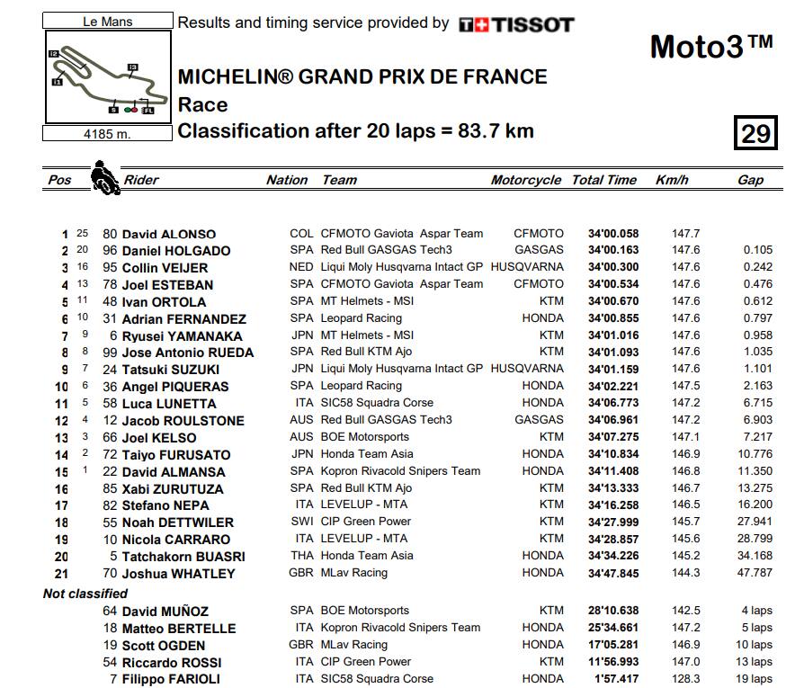 Moto3, l'ordine d'arrivo del GP Francia