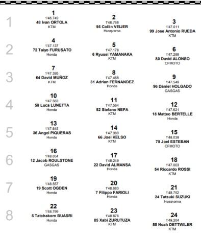 Nulla di compromesso in prospettiva gara, il pilota di Aspar ha il miglior passo di tutta la griglia, per il podio c’è anche lui, al suo rientro al box non ha mostrato eccessivi disappunti. Che lui sia il riferimento di questo gran premio, lo dimostra la quantità di colleghi che si attaccano alla sua moto per sfruttarne la scia. Rueda l’ha seguito come un’ombra per tutta la sessione, rientrando a cambiare la gomma posteriore quando rientrava David. In attesa di eventuali verifiche e ripensamenti, la griglia del gran premio vede, ad ogni modo, in prima fila, Ortola come detto, insieme a Veijer, come al solito veloce, e Rueda. Alonso chiude la seconda, il laeder del mondiale Holgado (in testa per un solo punto di scarto), chiude la terza con il nono. Gli Italiani sono tutti indietro: caduto Rossi (finito al diciottesimo posto), il migliore è Lunetta, decimo, che apre una fila tutta tricolore con Nepa, undicesimo, e Bertelle dodicesimo.