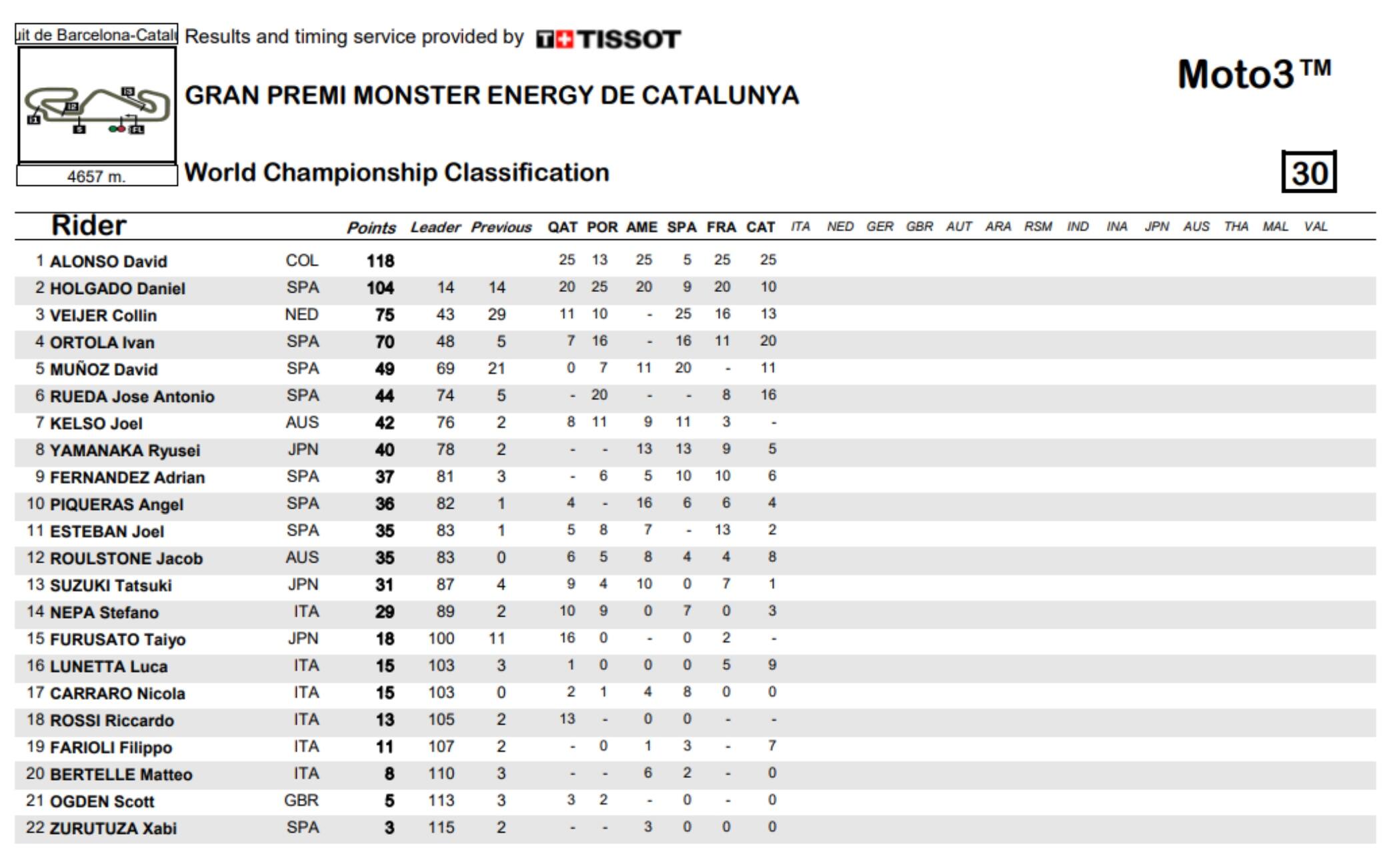 GP CATALUNYADavid Alonso rimonta dalla sesta posizione, conquista il successo e diventa il nuovo leader del Mondiale, staccando Holgado di 14 punti. Con lui sul podio Ortola e Rueda. Grande prestazione di Lunetta, 2006 al debutto in Moto3, che si piazza settimo