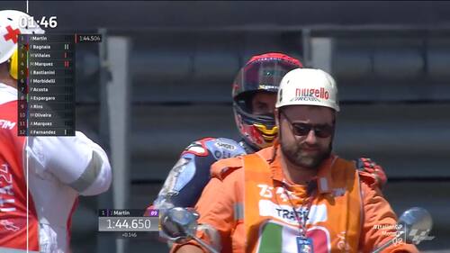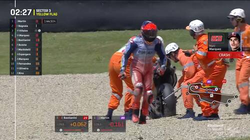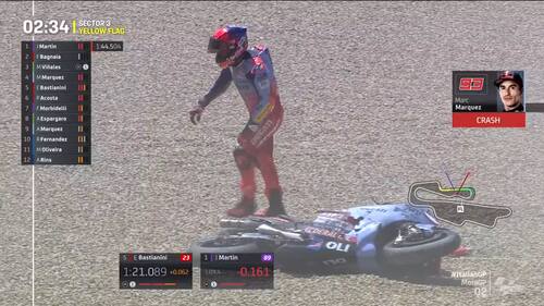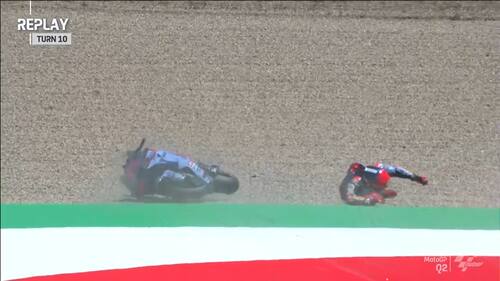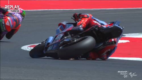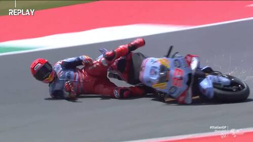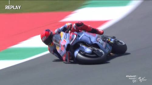 - Nei minuti finali del Q2 al Mugello Marc Marquez è poi scivolato terminando in anticipo la sua sessione. Fortunatamente nessuna conseguenza fisica per il pilota spagnolo, che nella Sprint scatterà 4° e nella gara lunga di domenica 3° (grazie alla penalità inflitta a Bagnaia)