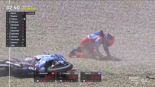 Nel corso delle qualifiche al Mugello, Marc Marquez è scivolato a pochi minuti dalla fine del Q2 chiudendo in anticipo la sua sessione. Lo spagnolo, che nella Sprint partirà 4° e nella gara lunga 3° (grazie alla penalità inflitta a Bagnaia), qualche minuto prima si era preso un rischio con Pedro Acosta nel tentativo di cercare un gancio per sfruttare la scia. Di seguito le fotosequenze e i video dei due episodi