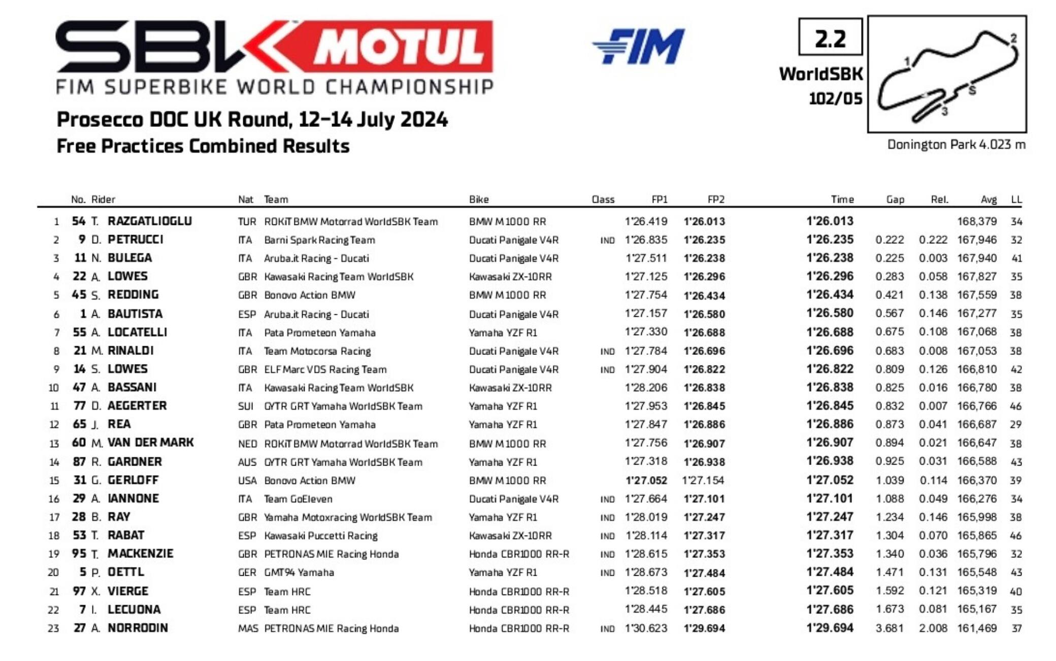 Il turco di casa BMW comanda la classifica davanti a due gradite note tricolore. Nonostante le condizioni fisiche ancora precarie, Danilo Petrucci ha chiuso entrambe le sessioni al secondo posto a due decimi dal miglior tempo di Razgatlioglu; Nicolò Bulega è appena tre millesimi dietro di lui, con qualche uscita di pista e la necessità di capire il comportamento della Ducati Panigale V4 R su una pista così fisica.