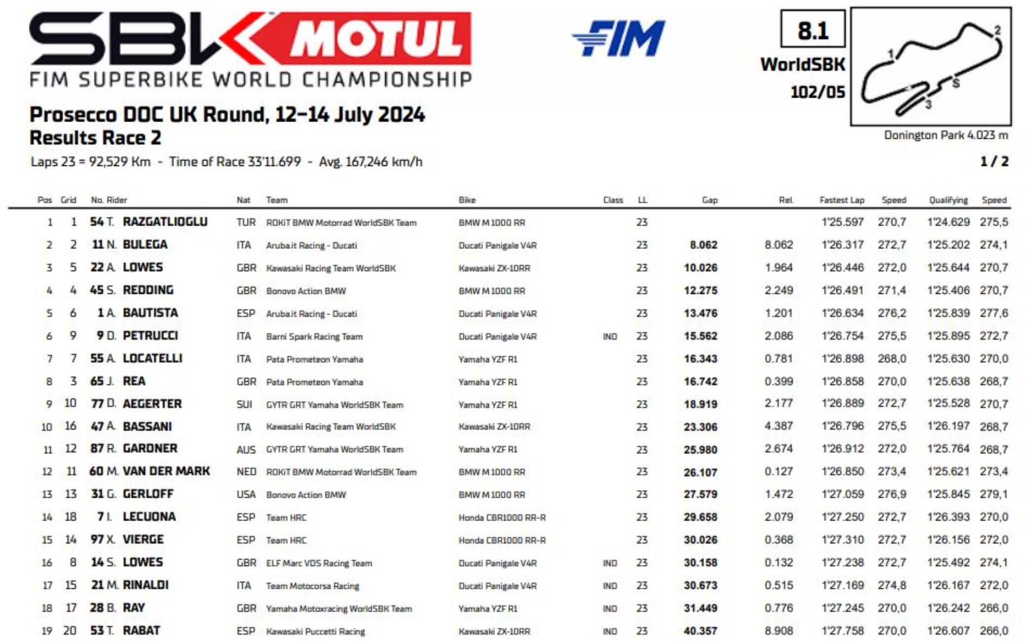 Gara 2 è stata l’ennesimo soliloquio di Razgatlioglu, che forte della sua superiorità si è concesso il lusso di festeggiare con una nuova gag, ironizzando sul reclamo presentato da Ducati sulla sua sella ribassata. Bulega si è confermato seconda forza battendo stavolta Alex Lowes, nuovamente a podio dopo i fasti di gara 1 e sempre più in sintonia con la sua Kawasaki ZX-10RR. Si toglie una bella soddisfazione anche Scott Redding, che rimedia al ritiro della prima corsa con un doppio quarto posto. In quinta posizione ecco Alvaro Bautista, autore di un sesto posto in Superpole Race e caduto rovinosamente nel giro di allineamento di gara 2: la sua Ducati è stata rimessa in sesto sulla griglia di partenza dal team Aruba, ma il tempo perso nelle prime fasi non gli ha consentito di lottare per il podio. Danilo Petrucci è il primo degli indipendenti e sesto assoluto, davanti ad Andrea Locatelli e Jonathan Rea. Axel Bassani si consola dalla caduta della sprint con il decimo posto di gara 2, dove Michael Ruben Rinaldi (17°) manca i punti. Ritirato per dolore acuto al braccio destro Andrea Iannone.