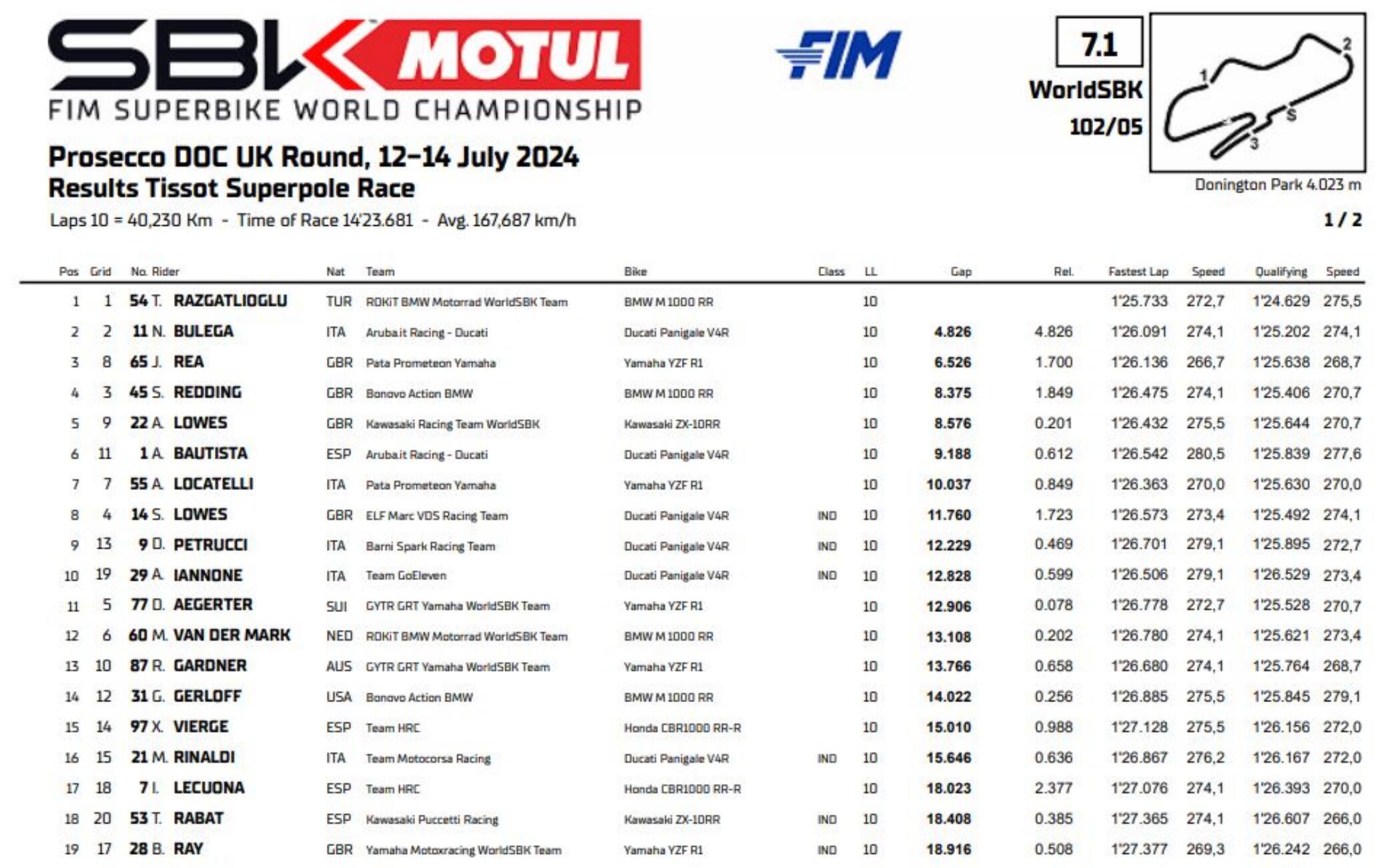 Toprak Razgatlioglu rispetta i pronostici e fa sue le gare della domenica di Superbike a Donington, centrando l’obiettivo della tripletta. Il copione è stato lo stesso del sabato, con un dominio sostanzialmente incontrastato a partire dalla Superpole Race della mattinata: al di là di una sfuriata iniziale di Nicolò Bulega, il turco ha condotto tutti i giri a disposizione scavando un solco tra sé e il gruppo. L'italiano ha terminato secondo dopo aver ritrovato il feeling giusto con la sua Ducati, mentre la storia lieta di giornata è il ritorno sul podio di Jonathan Rea, 3° su Yamaha.