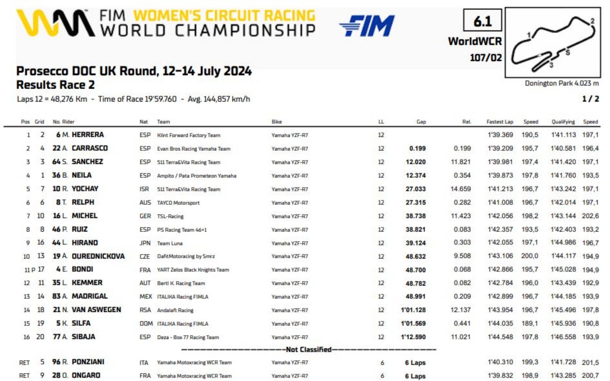 Nel campionato femminile WorldWCR è Maria Herrera a emergere in gara 2. La pilota di Forward Racing ha reagito al quarto posto del sabato strappando il successo ad Ana Carrasco, sulla quale allunga in classifica generale portando a sette i punti di vantaggio. Le due big della categoria hanno fatto il vuoto lasciando Sara Sanchez e Beatriz Neila a competere per il terzo posto, andato alla prima delle due. Con la caduta di Roberta Ponziani e Ornella Ongaro, Ran Yochay conquista la quinta posizione battendo Tayla Relph in volata.