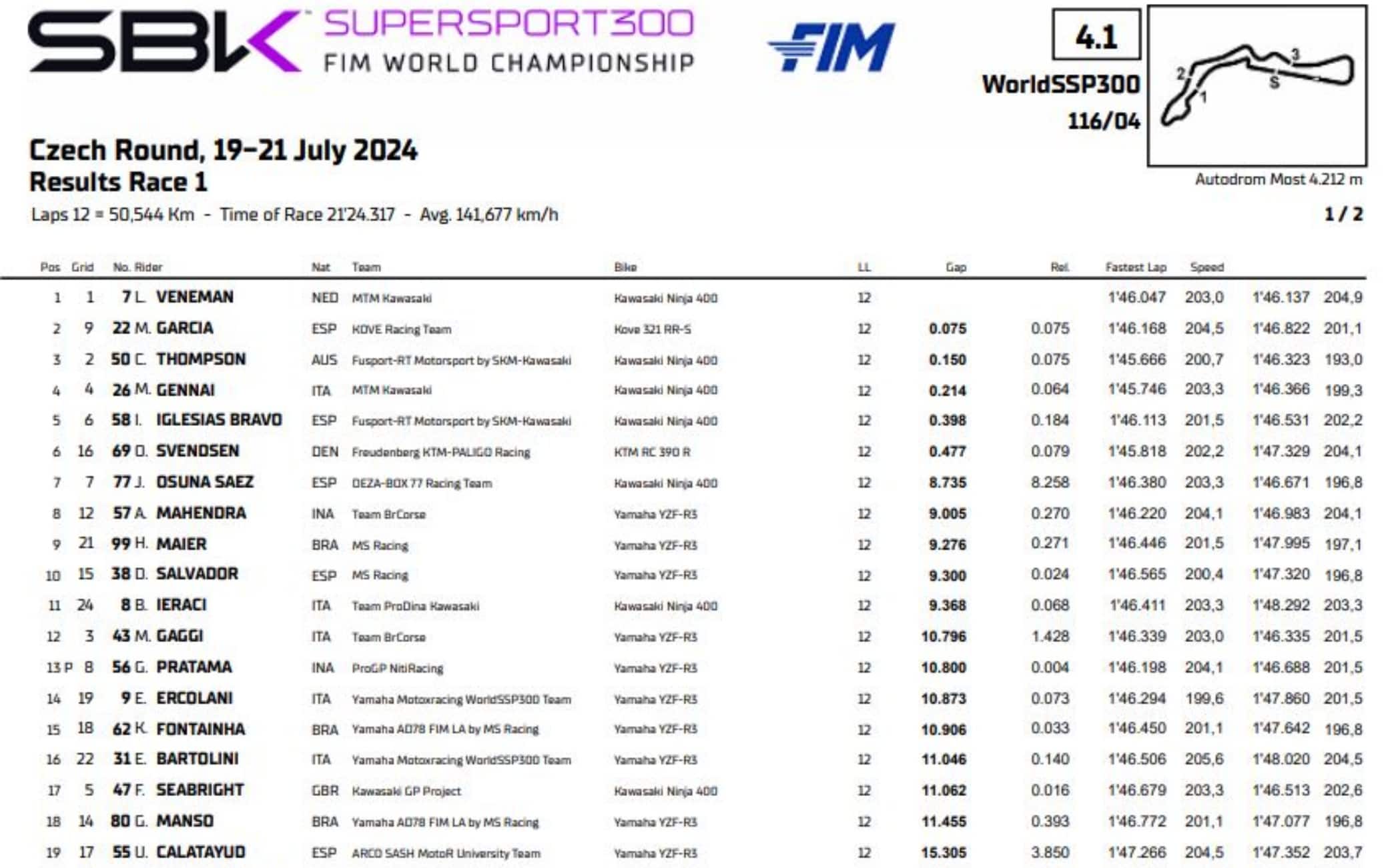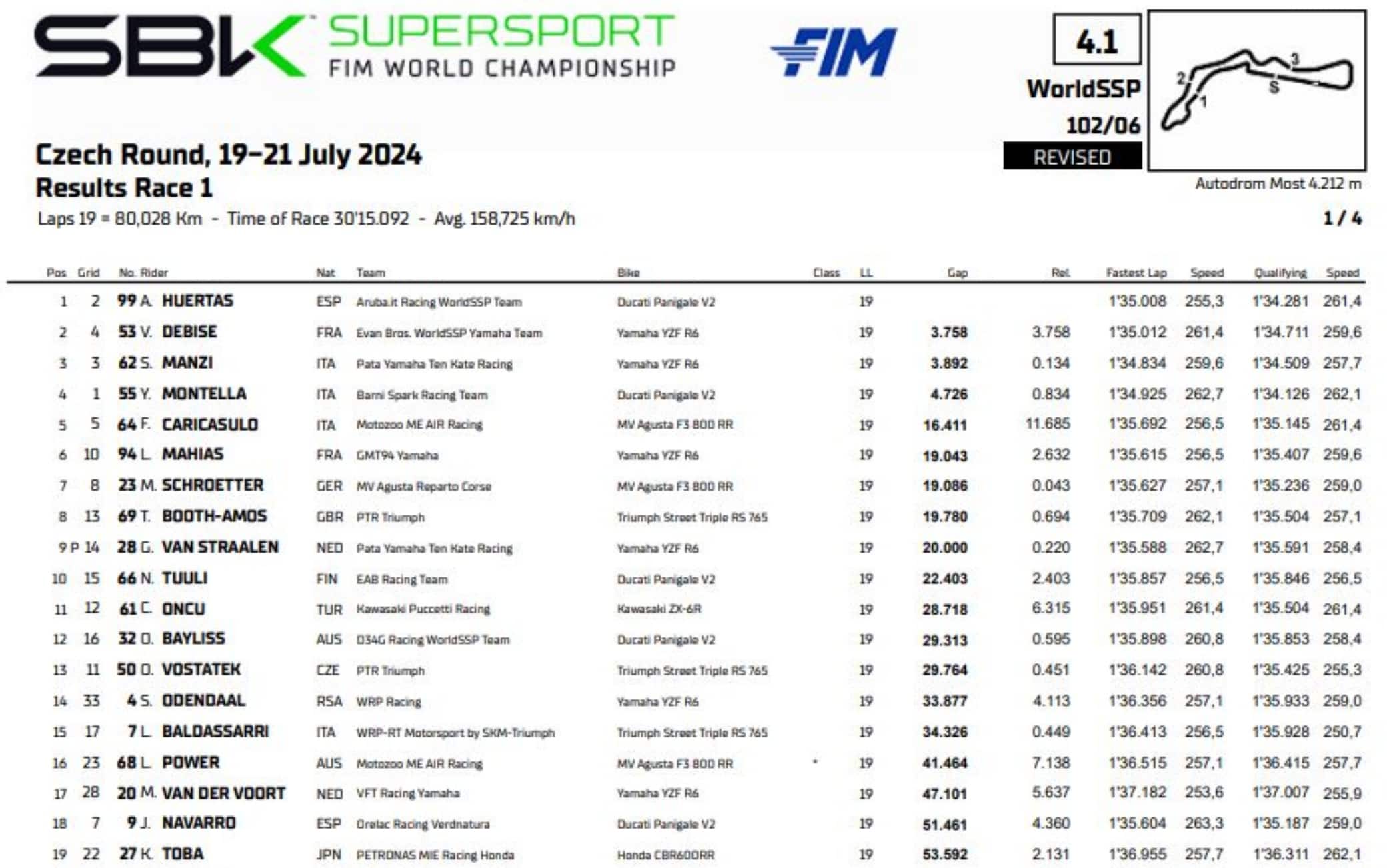 La vera sorpresa di giornata è però Debise, che all’ultimo giro ha infilato Manzi alla curva quindici e poi ha difeso caparbiamente la seconda posizione. Complice il rallentamento delle Ducati (a cui è stata ridotta l’apertura della farfalla tra i 100 e i 150km/h), a Most le Yamaha R6 sono riuscite a stare al passo, come dimostra il terzo posto di Manzi davanti a Montella. Il pilota campano paga quindi nove punti da Huertas, portando il suo divario in classifica a trentaquattro lunghezze.