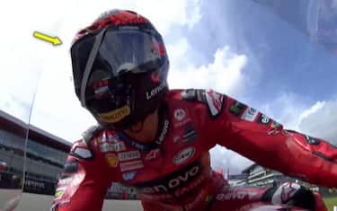- Bagnaia ha così dovuto necessariamente rallentare per provare a strappare l'adesivo. Impossibile guidare a oltre 300km/h in quelle condizioni...