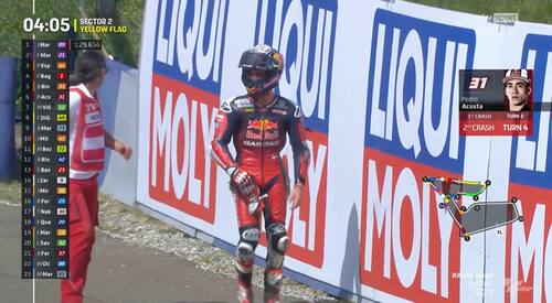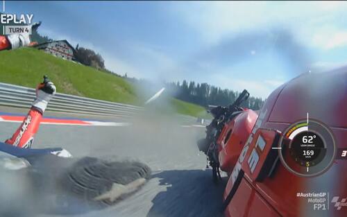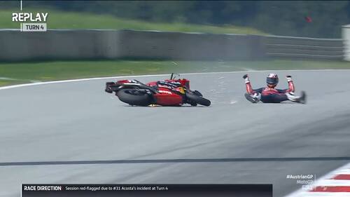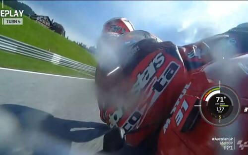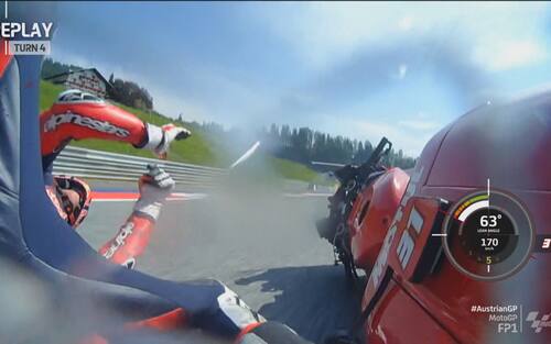 Brutta caduta per Acosta durante le prove libere in Austria: tocca i freni nel tratto compreso tra curva 3 e curva 4 e viene disarcionato dalla moto a 290 km/h. Pilota fortunatamente ok, mentre è inevitabile l'intervento della bandiera rossa (stop durato 4 minuti) per permettere di pulire il tracciato. Una sessione complicata per lo spagnolo, che era scivolato poco prima in un altro punto della pista. Di seguito la fotosequenza della caduta