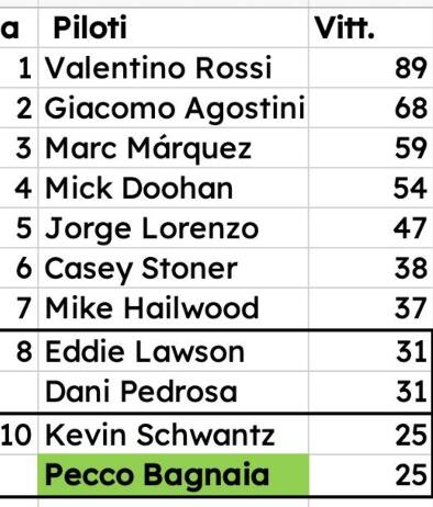 Bagnaia entra nella top-10 di tutti i tempi dei vincitori in top-class, affiancando Kevin Schwantz: sono 25 vittorie a testa, in una classifica di grandi nomi. Per Pecco è anche la 7^ vittoria stagionale, ad eguagliare, con 9 GP da disputare, le ultime due stagioni, le migliori per lui, ed ora nel mirino c’è il record Ducati di Stoner del 2007 (10). Al Red Bull Ring si è registrato un doppio pareggio, perché se Bagnaia ha eguagliato Schwantz, che ha ottenuto tutti e 34 i suoi successi con la Suzuki, la Ducati ha eguagliato proprio la Suzuki per vittorie in top-class, 97, al 4° posto di tutti i tempi. Ora la scalata per il terzo posto richiede un po' di pazienza: la MV Agusta è a 139, mentre i primi 2 posti sono al momento un miraggio (Honda a 313 e Yamaha a 245).