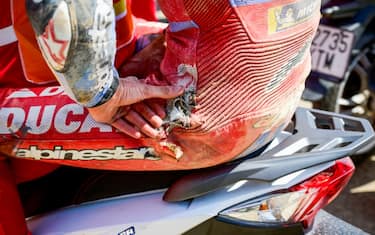 In quest'immagine si può vedere la tuta malconcia di Bagnaia dopo il brutto incidente con Alex Marquez