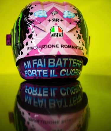 Nella superiore "Rivoluzione Romantica", mentre nella più grande c'è una dedica a Misano. "Questo casco per me è molto importante - ha spiegato su Sky Sport. Lo abbiamo fatto io e i miei amici. È un messaggio per tutta la gente di Misano che mi fa battere forte il cuore, in questo periodo devo dire che i tifosi mi stanno aiutando tantissimo".