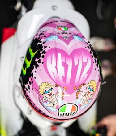 'Rivoluzione Romantica' per Marco Bezzecchi. Il pilota del team Pertamina VR46 ha presentato un casco rosa con diversi cuori. Nel più grande c'è il suo nick "Bez72" con due angeli cupido