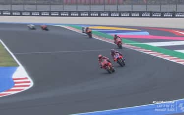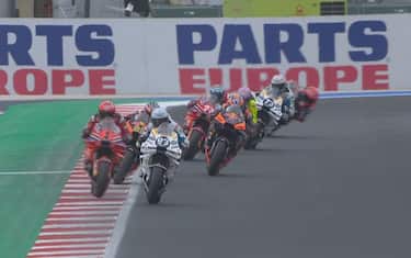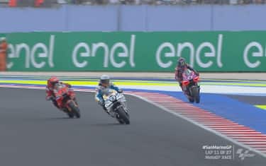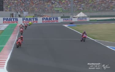 Nel corso del settimo giro del Gp di Misano è aumentata l'intensità della pioggia. Bagnaia era al comando, con Martin, Bastianini, Binder e Marc Marquez alle sue spalle