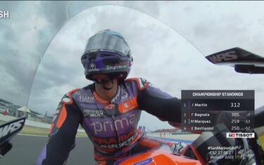 Gara condizionata dalla pioggia per Martin a Misano. Al 7° giro il pilota spagnolo, in quel momento in seconda posizione alle spalle di Bagnaia, è tornato ai box per prendere la moto da bagnato in seguito a uno scroscio d'acqua, ma dopo poco è dovuto rientrare per riprendere quella da asciutto scivolando fino al 15° posto. "È chiaro che è stato un errore di strategia - ha spiegato su Sky -. Avrei dovuto anche aspettare la scelta di Bagnaia, visto che è il mio avversario principale. Questo è sicuro, lo so. Ho preso un punticino, però sono veloce e se non avesse piovuto penso che me la sarei giocata con Pecco"