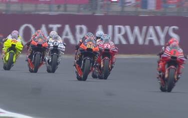 I piloti di testa hanno iniziato a rallentare a causa delle condizioni della pista, resa scivolosa dalla pioggia. Si è formato un gruppone con Bagnaia al comando e Binder alle sue spalle