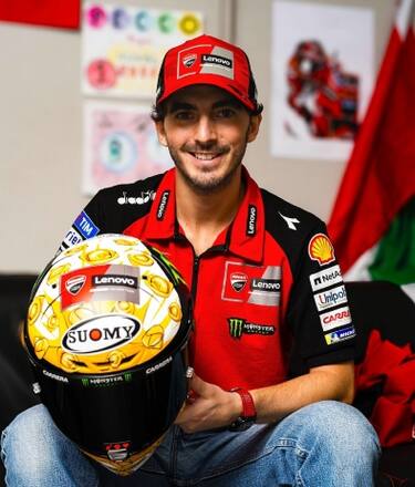 Per il GP dell'Emilia-Romagna, secondo appuntamento stagionale a Misano dopo il GP di San Marino, Pecco Bagnaia ha deciso di portare in pista un casco particolare con sopra disegnati dei tortellini in brodo.