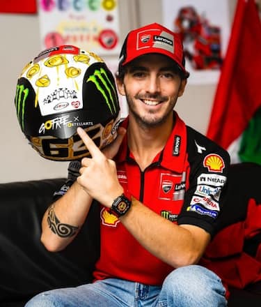 Il casco è stato ideato insieme allo chef Massimo Bottura, grande amico di Bagnaia: "I tortellini in brodo per me sono casa e famiglia, da sempre - ha scritto Pecco su Instagram. È un grandissimo onore portare in pista questo casco realizzato insieme al mio amico Massimo Bottura, per omaggiare la realtà del Tortellante".