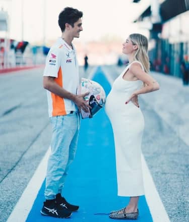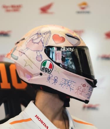 Nella parte bassa del casco, invece, c'è la cronistoria della storia d'amore tra Marini e sua moglie: "Il primo bacio, la proposta, il matrimonio e ora una bambina in arrivo!", ha scritto HRC su Instagram