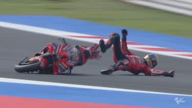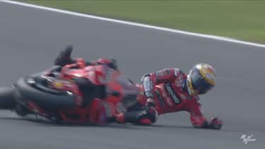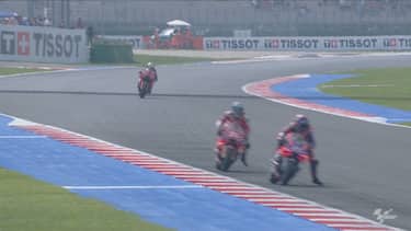 Bagnaia, scattato dalla pole, era finito in terza posizione alle spalle di Martin e Bastianini con circa 3 secondi di distacco dai primi. Prima della caduta aveva fatto segnare dei super tempi ed era riuscito ad avvicinarsi alla testa della corsa