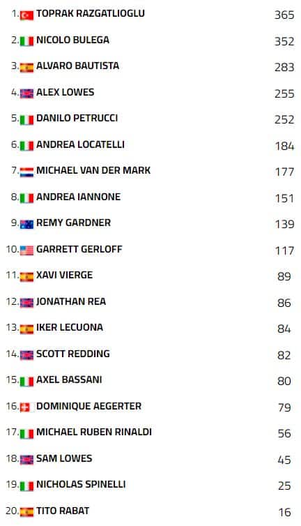 Altrettanto efficace il ritmo di Garrett Gerloff, quarto davanti a Lowes. Il bel fine settimana delle Honda si chiude con il sesto posto di Iker Lecuona e l’ottavo di Xavi Vierge, intervallati da Michael Van Der Mark. In top ten anche Andrea Locatelli e Tito Rabat, con punti anche per Michael Ruben Rinaldi in tredicesima posizione. Sedicesimo Alessandro Delbianco e diciannovesimo Nicolò Canepa, con Axel Bassani caduto nelle prime battute. Iannone si è dovuto ritirare, invece, a causa della rottura della pedana in un contatto con Locatelli.
