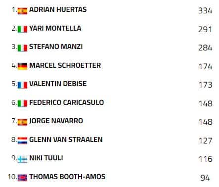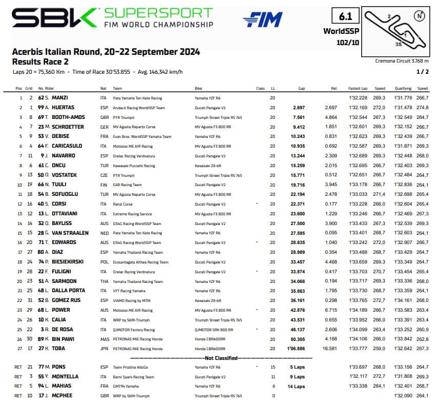 Huertas si consola con venti punti pesantissimi guadagnati su Yari Montella, scivolato alla curva sette mentre comandava le operazioni e sembrava avere in mano la gara. Uno zero pesante quello del pilota campano, che lo relega a meno quarantatré punti dal rivale e lo espone al rientro di Manzi (staccato di sette lunghezze) per il secondo posto nella generale. A chiudere il podio di Gara 2 è Tom Booth-Amos su Triumph, al suo primo arrivo nei tre in Supersport. Marcel Schroetter ripete il risultato di Gara 1 e conclude quarto su Valentin Debise e Federico Caricasulo. Punti iridati anche per Simone Corsi, dodicesimo e vincitore nella classifica del Challenge, e Luca Ottaviani alle sue spalle.