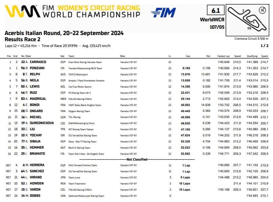 Nel WorldWCR terzo successo stagionale per Ana Carrasco, che guadagna il primato in classifica a causa della caduta di Maria Herrera: un errore di Sara Sanchez all’ultimo giro ha generato una carambola che ha coinvolto la pilota del team Forward. Primo podio in campionato per Roberta Ponziani, seconda a pochi millesimi dalla vittoria, e Tayla Relph, che ha preceduto Beatriz Neila e Avalon Lewis.
