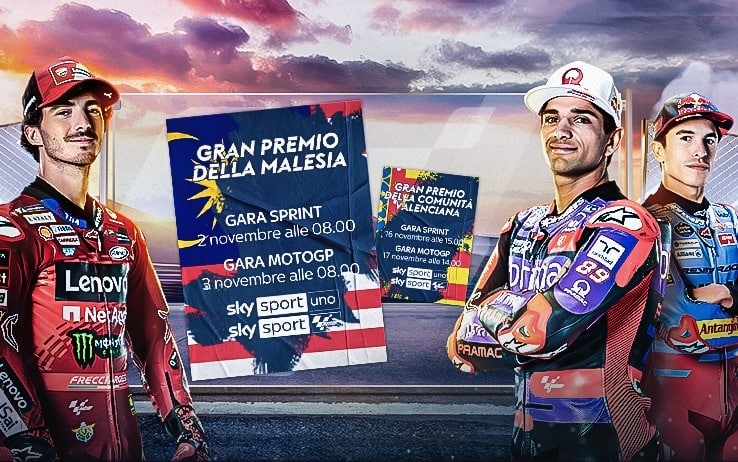 1-3 novembreArchiviato l'impegno in Thailandia con le vittorie di Bastianini nella Sprint e di Bagnaia nella gara lunga, la MotoGP prosegue il suo tour extraeuropeo prima di tornare a Valencia per l'ultimo appuntamento del 17 novembre. Si corre in Malesia nel weekend dell'1-3 novembre, LIVE su Sky Sport e in streaming su NOW. Il leader della classifica Jorge Martin avrà il primo match point mondiale per chiudere definitivamente i conti, ma Bagnaia non sarà certamente d'accordo...