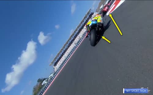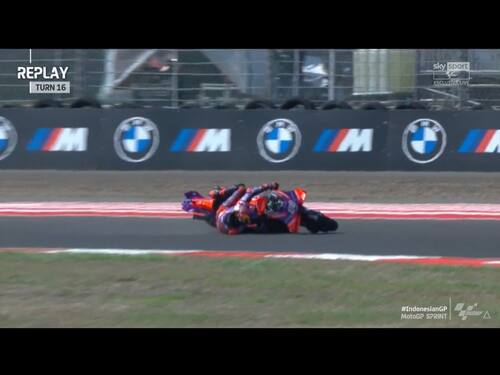 - "Difficile dare delle colpe a Jorge per la caduta. Dalle immagini si vede una riga nera di fianco alla moto di Bezzecchi, indicata dalla freccia"