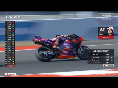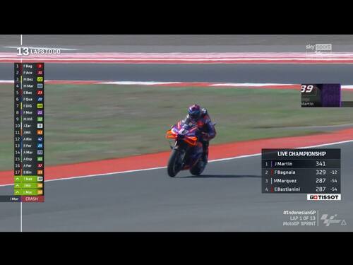 - Clamoroso a Mandalika: scattato (bene) dalla pole e grande favorito per la vittoria, Jorge Martin è scivolato poco dopo il via, compromettendo la sua gara. Il pilota della Pramac è riuscito a ripartire, rimontando fino al 10° posto ma restando fuori dalla zona punti. La vittoria di Bagnaia lo riavvicina nel Mondiale: Pecco è ora a sole 12 lunghezze dallo spagnolo