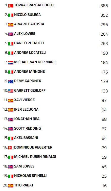Alle sue spalle si piazzano le BMW del rientrante Toprak Razgatlioglu del sorprendente Garrett Gerloff. Il turco bagna il ritorno con venti punti pesantissimi in classifica, specialmente alla luce dello zero di Nicolò Bulega, fermato da un problema tecnico prima della seconda partenza. Quanto al texano, il suo è un terzo posto pienamente convincente perché ottenuto scattando decimo e con tutti i protagonisti in pista, a partire da Alvaro Bautista che negli ultimi giri ha preso distacco concludendo quarto. Alle sue spalle, invece, Danilo Petrucci. Un buon sesto posto è il risultato finale di Iker Lecuona, che però poteva puntare a qualcosa in più alla luce della velocità mostrata nelle prove. Settima posizione per Alex Lowes seguito da Xavi Vierge, Michael Van Der Mark e Andrea Locatelli. A punti anche Axel Bassani, dodicesimo, e il già citato Rinaldi, tredicesimo.