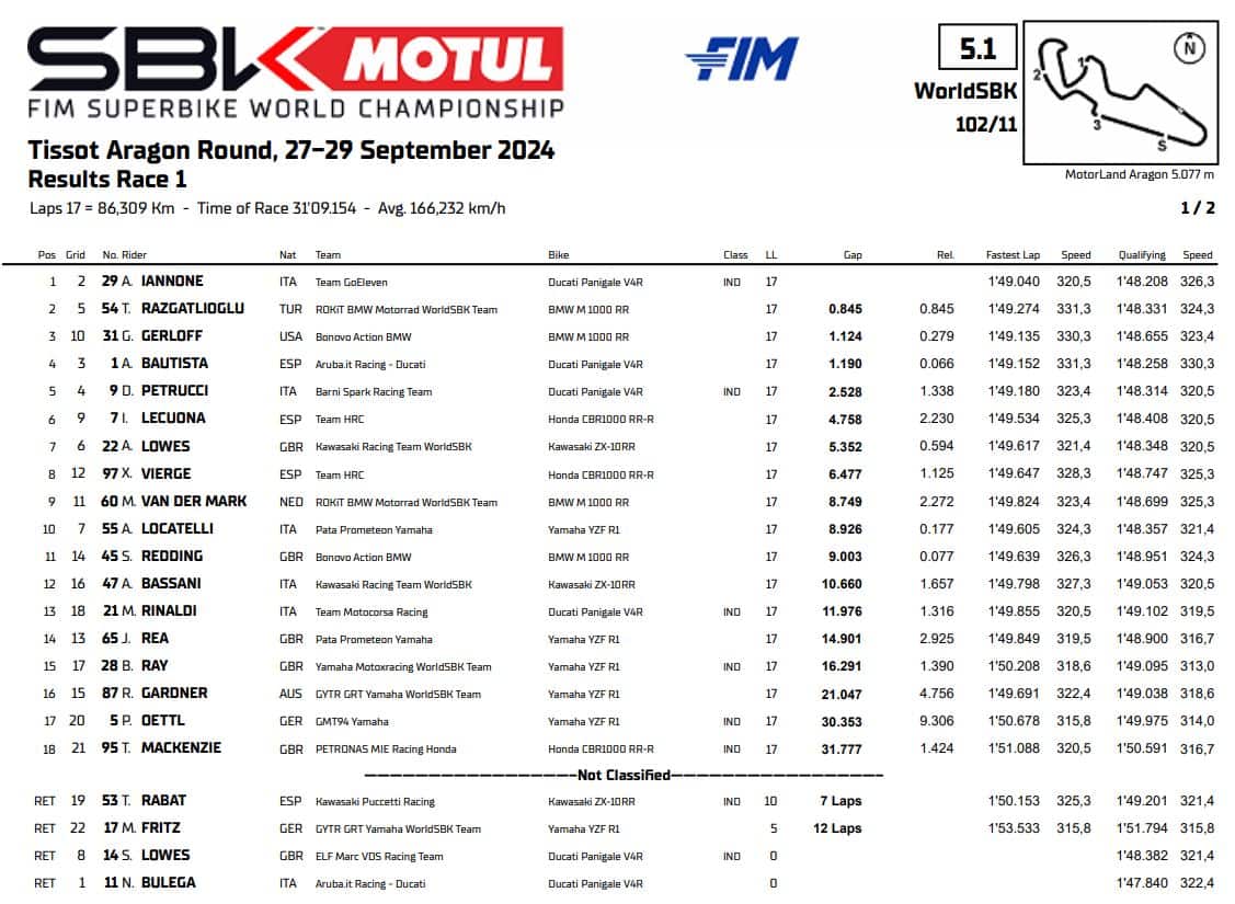 prima in SBK!Prima vittoria in Superbike per Andrea Iannone, che fa sua Gara-1 sul tracciato di Aragon lasciandosi alle spalle Razgatlioglu e Gerloff. Quarto Bautista. Ritiro nel warm up lap per Nicolò Bulega dopo un problema tecnico. Domani la seconda prova: tutto il weekend live su Sky e in streaming su NOW