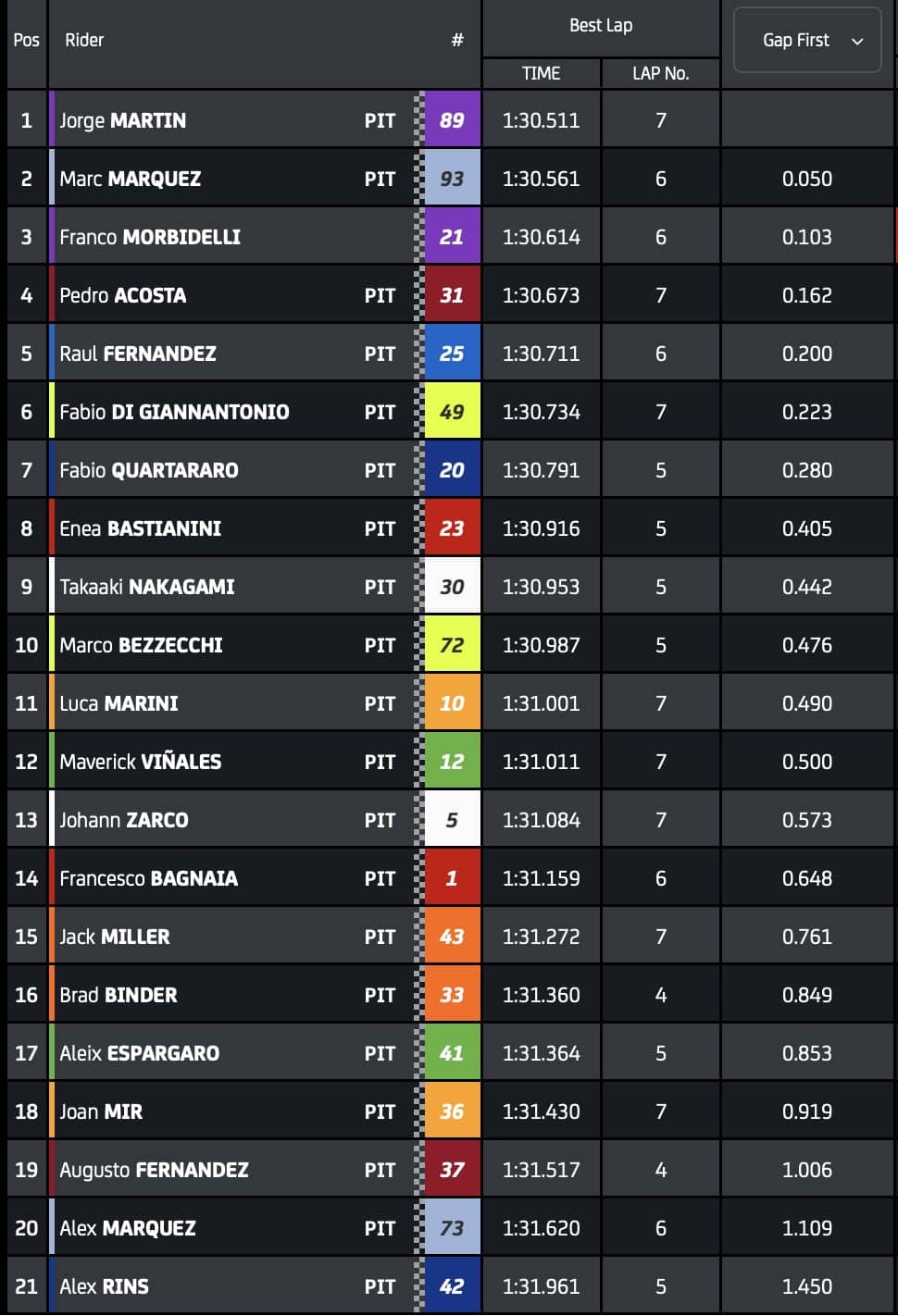 gp indonesiaJorge Martin vola e stampa il miglior tempo nel warm-up di Mandalika in 1'30''511. Dietro allo spagnolo ci sono Marc Marquez, Morbidelli e Acosta. Sesto Di Giannantonio, ottavo Bastianini e decimo Bezzecchi. Pecco Bagnaia è 14° ma grande equilibrio in pista, con i primi 18 piloti racchiusi in appena un secondo. Alle 9 il GP di Indonesia in diretta su Sky Sport Uno, Sky Sport MotoGP e in streaming su NOW