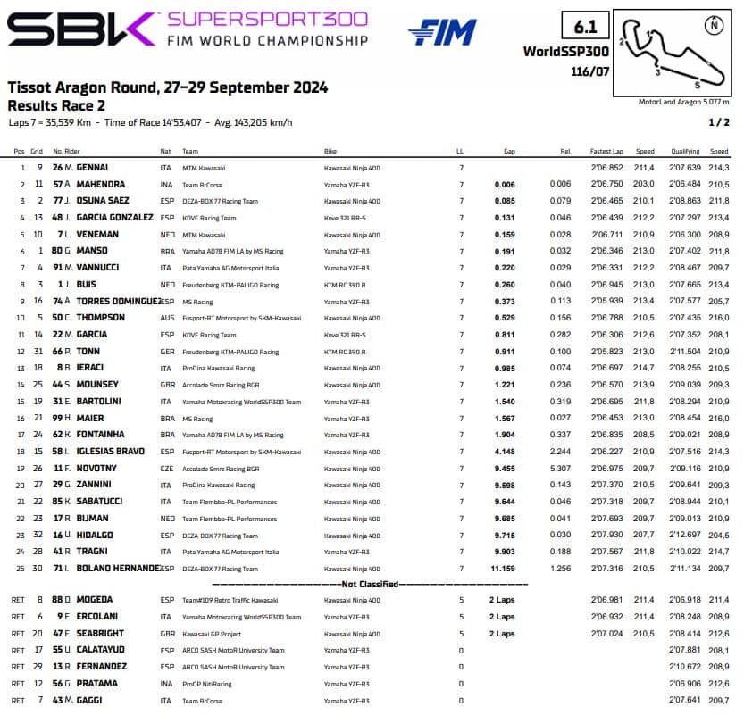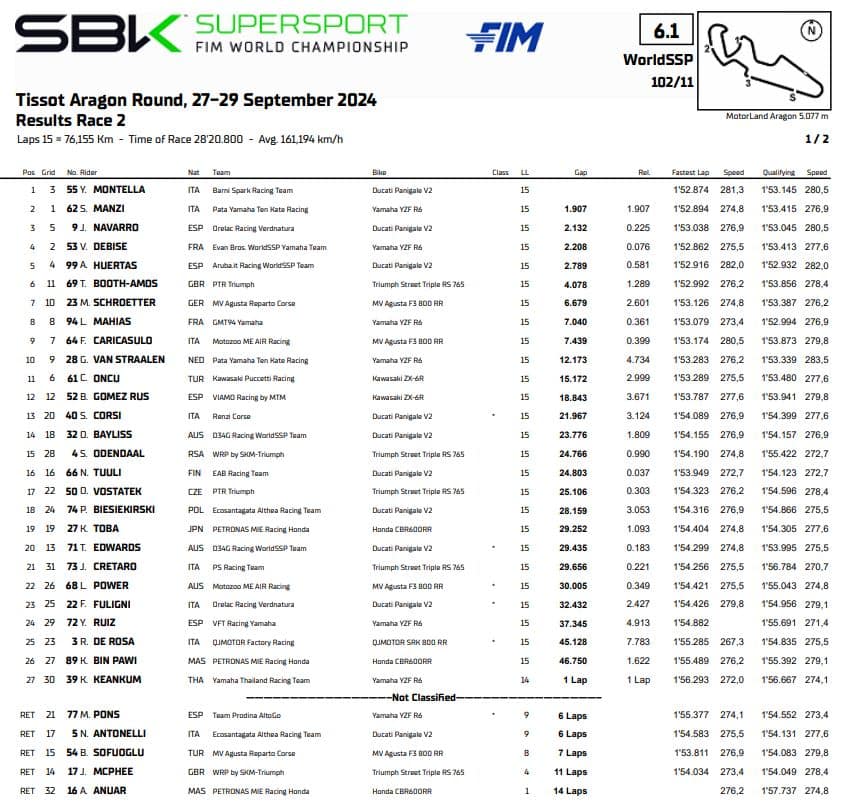 Montella sfrutta la domenica no di Huertas (5°) per fare sua Gara 2, Manzi e Navarro sul podio. In Supersport 300 Gennai vince per la terza volta in stagione, apprensione per Hendra.