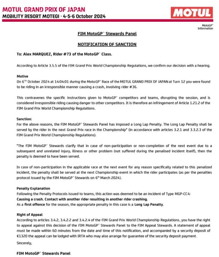 Il dispositivo dello Steward Panel con la decisione sull'incidente Alex Marquez-Mir