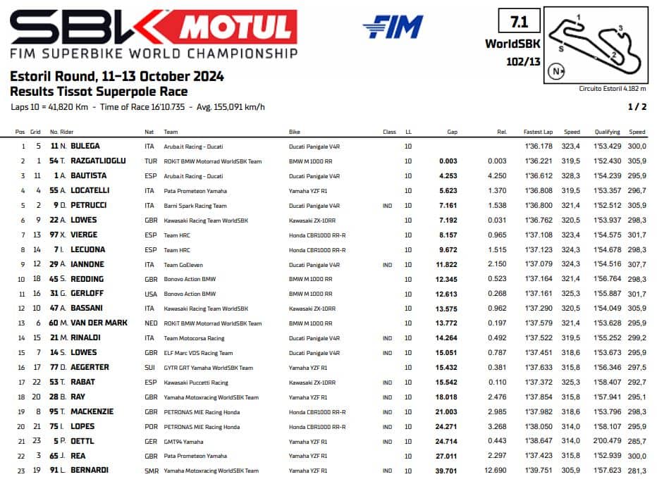 Il penultimo round del mondiale Superbike va in archivio con le gare di domenica dal tracciato di Estoril. A una Gara 2 molto lineare fa da contraltare una Superpole Race scoppiettante, con un finale al cardiopalma tra i duellanti per il titolo. Nicolò Bulega ha, infatti, preceduto Toprak Razgatlioglu al fotofinish per soli tre millesimi di secondo, il minor distacco per la vittoria nella storia della categoria.